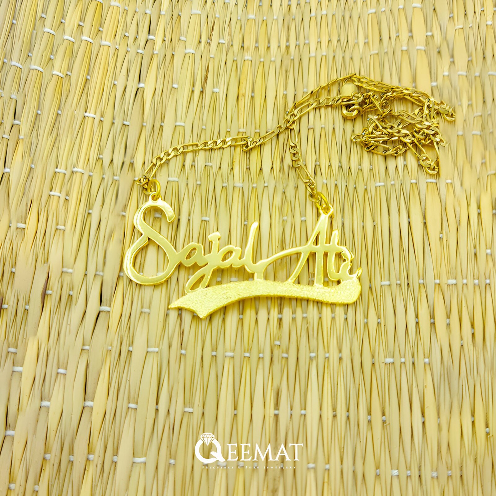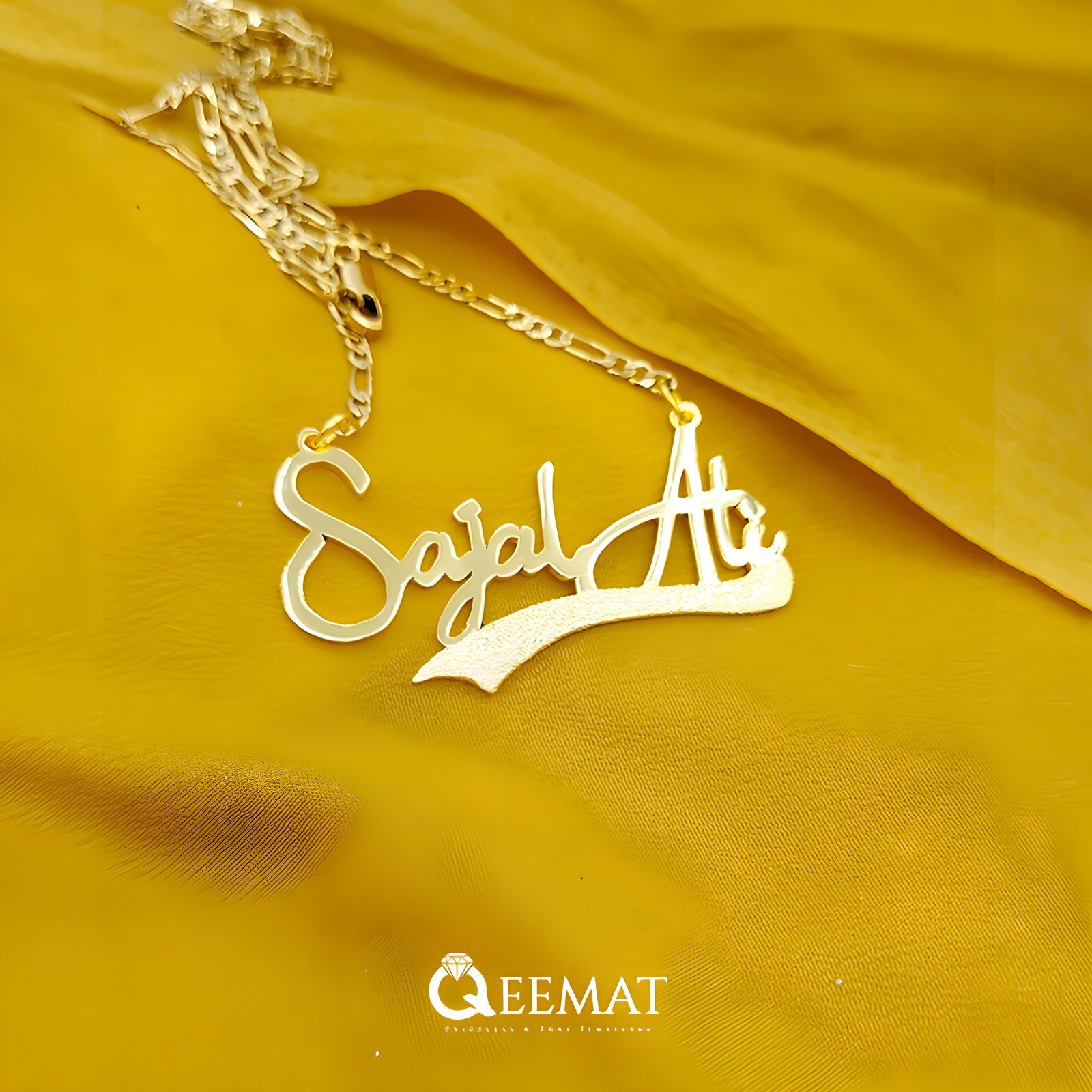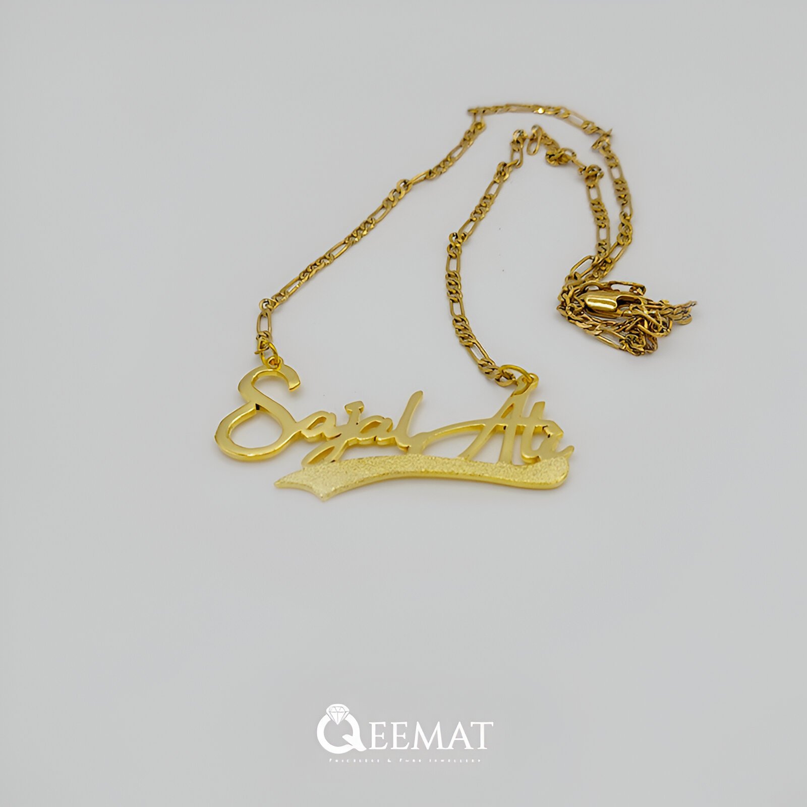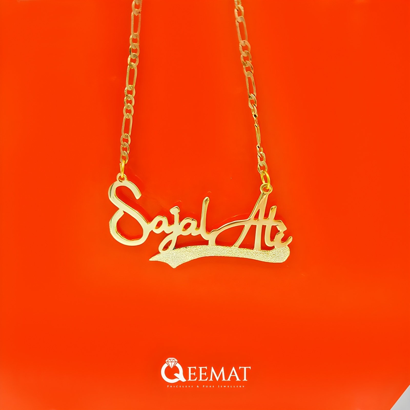 Order a beautiful custom name pendant in the following given Sajal Ali style. This beautiful pendant has two hooks to connect the chain with the locket and this thing makes the locket more unique and attractive especially when you have two words in your name.