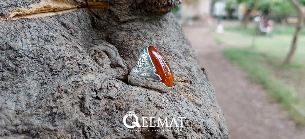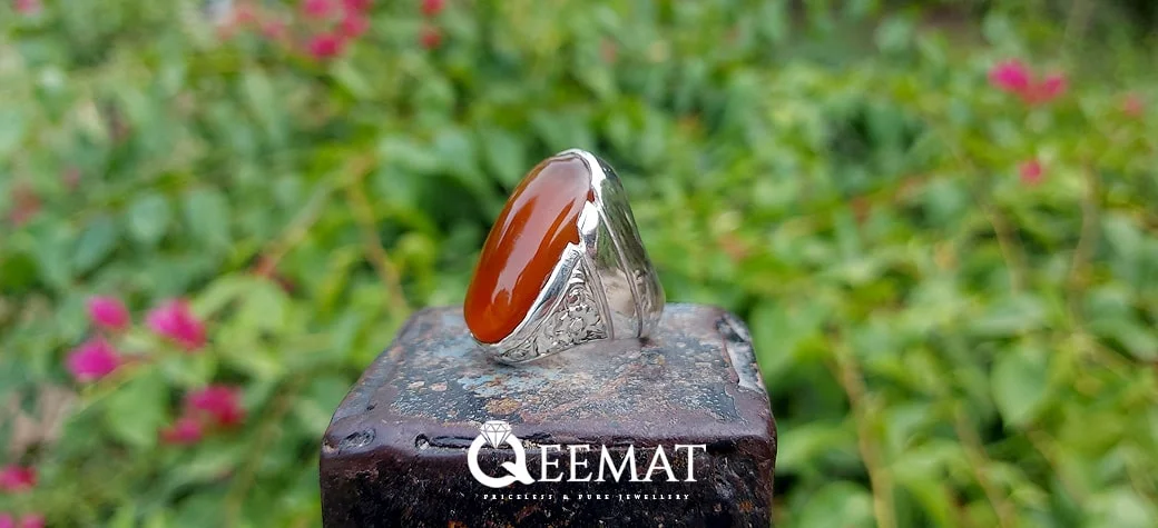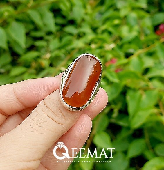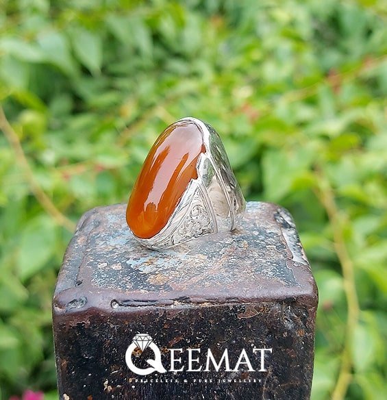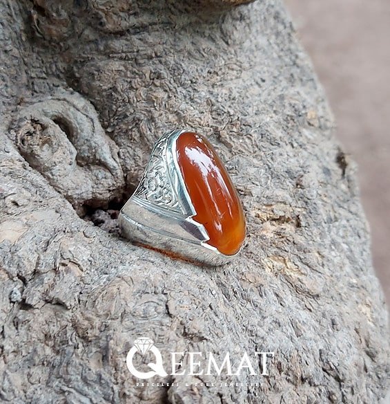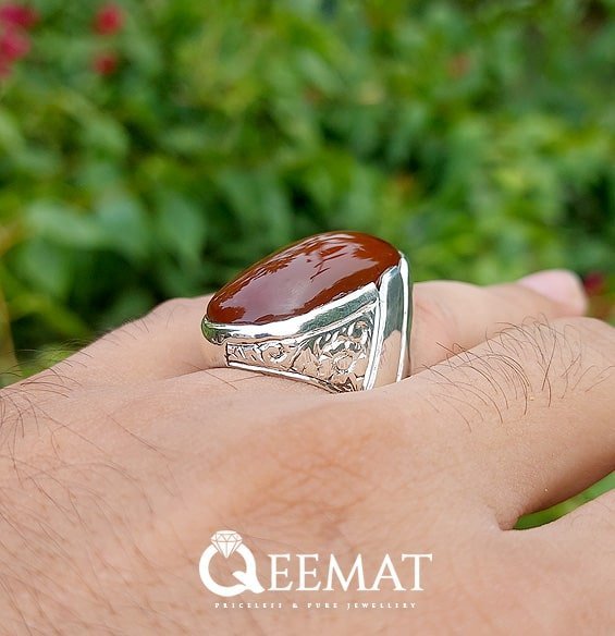 The smooth and rounded surface of the gemstone of this red agate ring is cherished for centuries to be used in men’s silver rings. With an intricated handcrafted design, this silver ring is centered with a well-polished dome-shaped stone. Men love the soft shine and glow of agates in cabochon shape as they are considered closer to its natural form. The structure of this cabochon stone ring is solid and its shank area is ornate with floral elements and traditional motifs. The high elevated decorated piece welded on both sides of the shank area is adding beauty and durability in this ring.