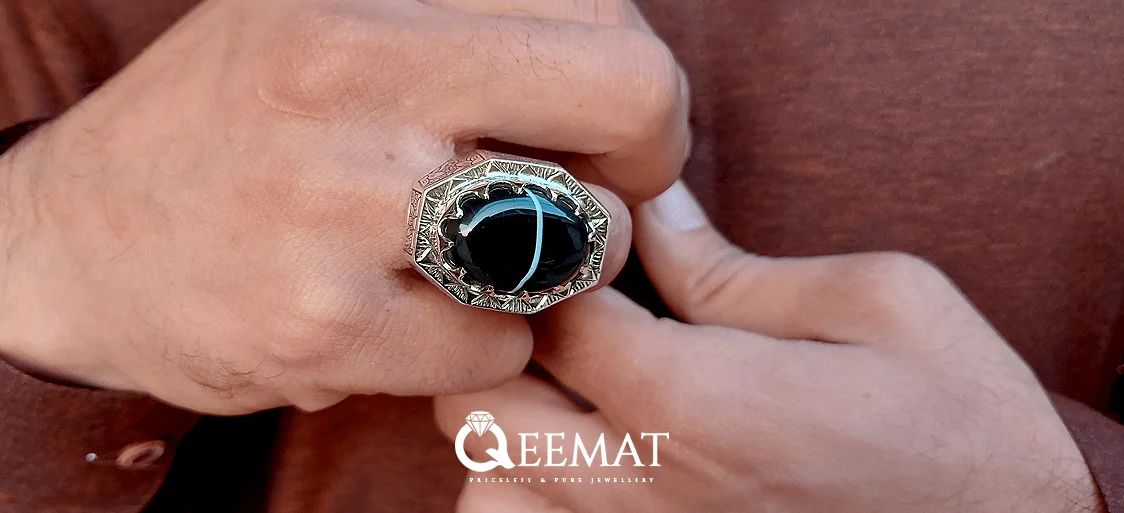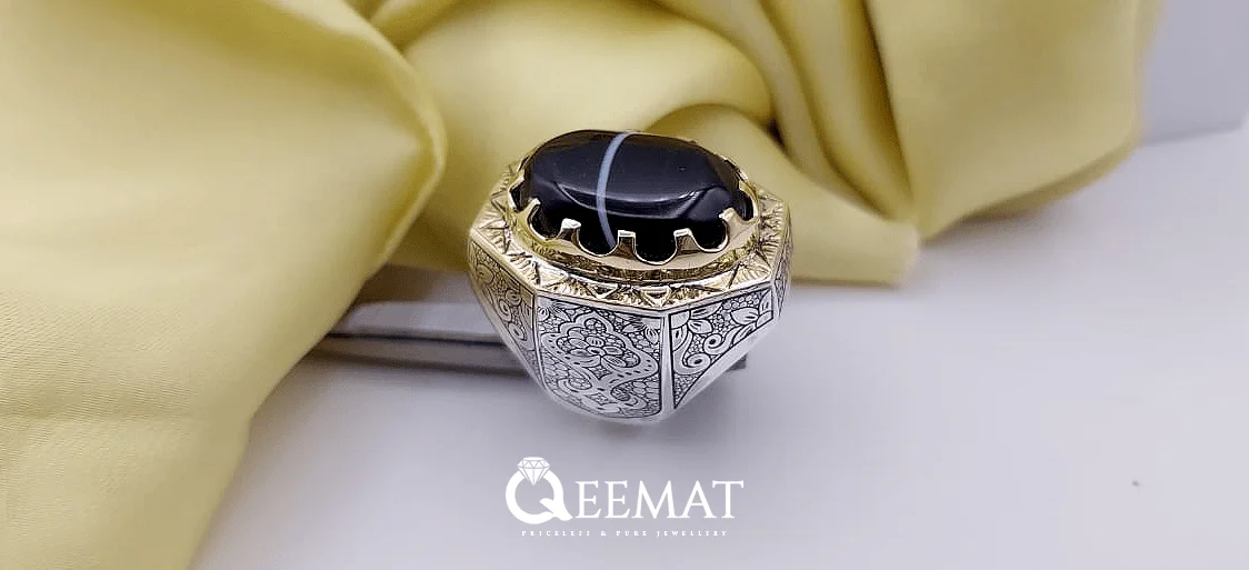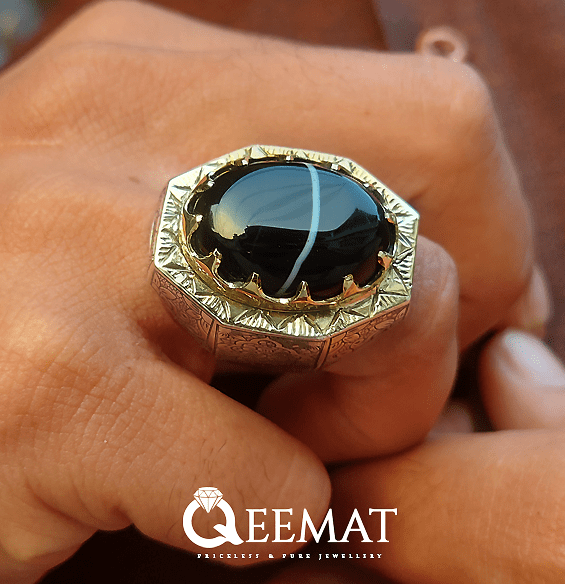 Agate stone is available naturally in many hues and colors. The black and white natural agate stone is popularly known as Soleimani Agate and the ring design which is shown here is especially made for men’s wedding event. This is a handmade octagonal ring with laser engraved design for wedding events.