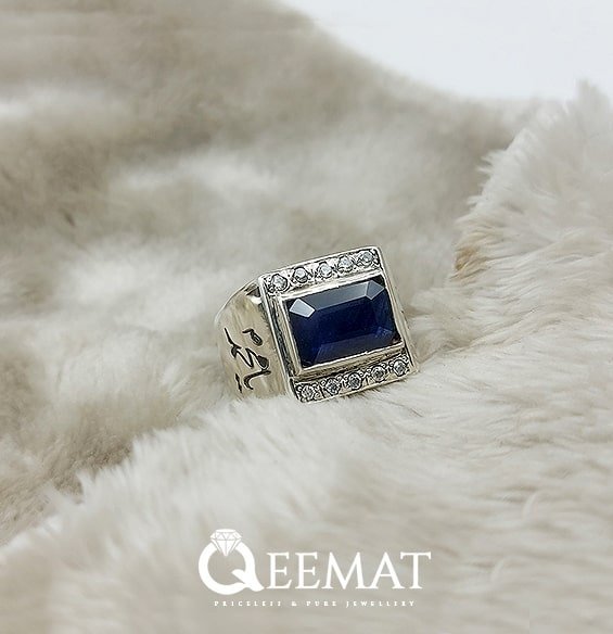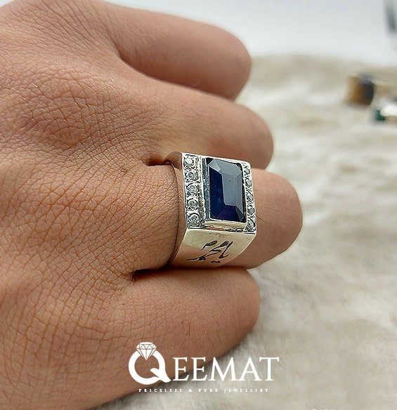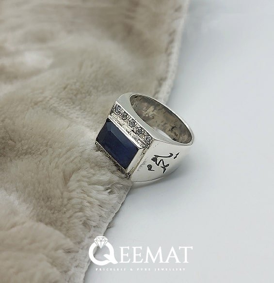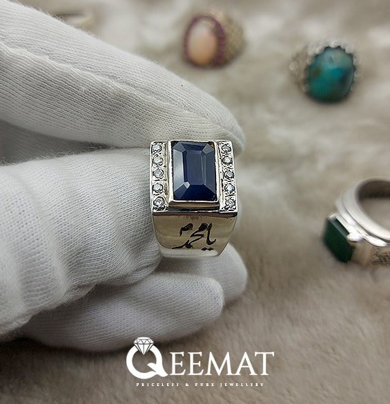 Being a devout of Islam, when you will gaze upon this beautiful baguette cut sapphire ring engraved with the names of Hazrat Mohammad (P.B.U.H) and Hazrat Ali (A.S), you will be happy to find the profound depth in Islamic heritage. This ring is made of premium sterling silver and it is customizable as well, you can get these names changed with the names of your choice. Also the same ring design with one central baguette cut stone and two arrays of smaller cubic zirconia stones, can be ordered with shapes inscribed on both sides instead of names.