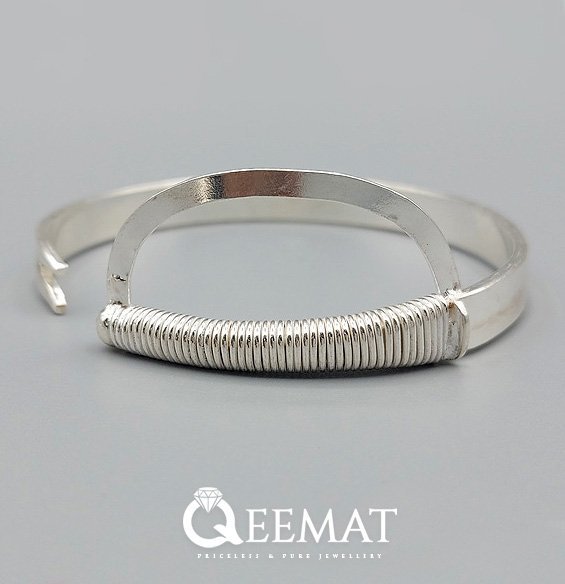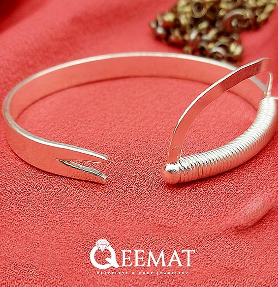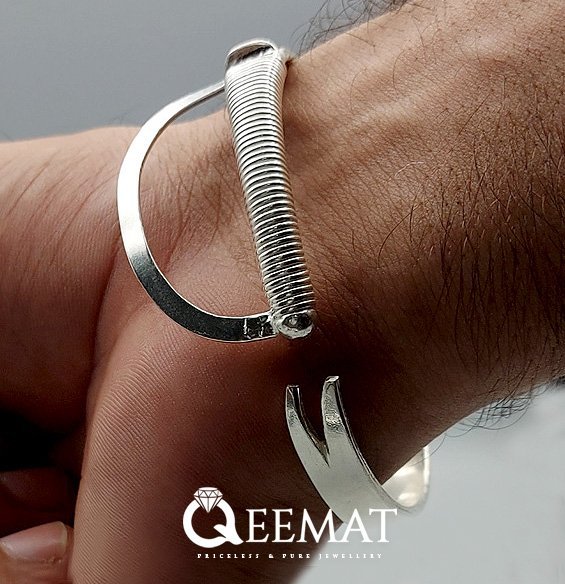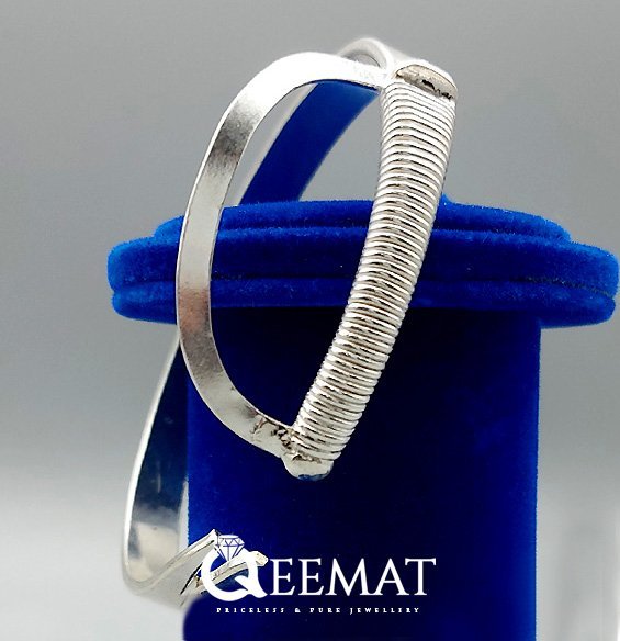 Sword-shaped or plain bracelet in talwar style is made of 17.5 grams of pure silver and is available online at a reasonable price on this website. This elegant and superbly designed bracelet is 19.6mm, and you can buy other gemstone bracelets and bracelets like Chitrai Kada made in pure silver and 23K-21K gold.