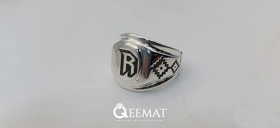 For expressing your unique identity or feelings of love, a name initials ring of sterling silver can be an ideal means. We have inscribed a name initial on top of the ring in head area with a blackish outline making it clearly visible from every angle. Another prominent thing about this ring is its durable framework and a square pattern flanking the shanks. You can order this make-to-order name ring as a birthday gift giving item in any size.