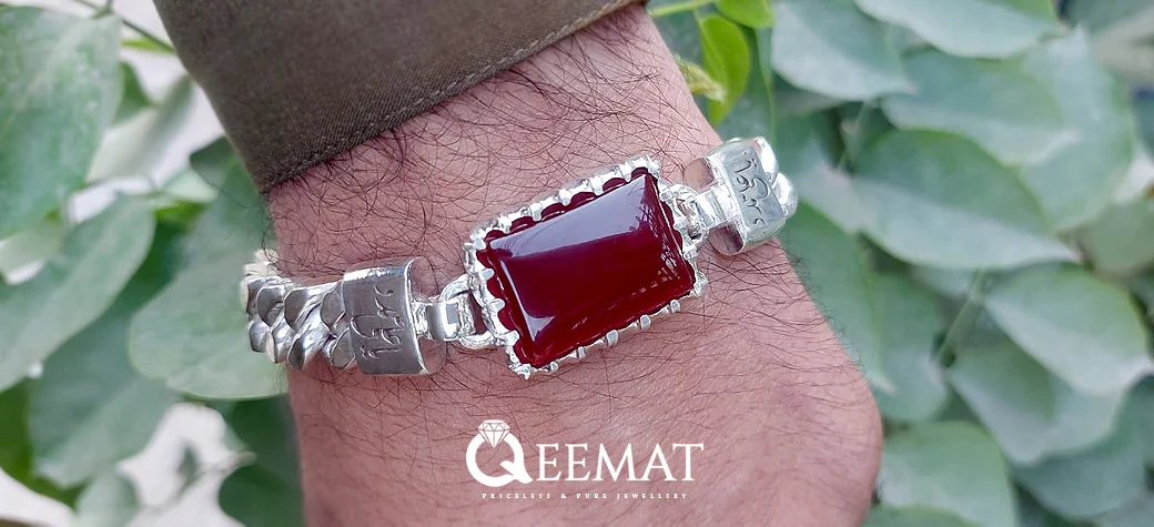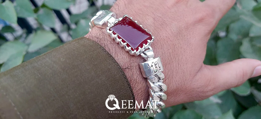 Flanking the stone on either side are silver segments engraved with Urdu calligraphy, which adds a cultural and spiritual elegance to the overall design. However, the Urdu engraving is completely customizable — any name, date, logo, or meaningful symbol can be engraved on these silver blocks instead, making the bracelet deeply personal and ideal for gifting. It can a couple name one on each side of the stone.