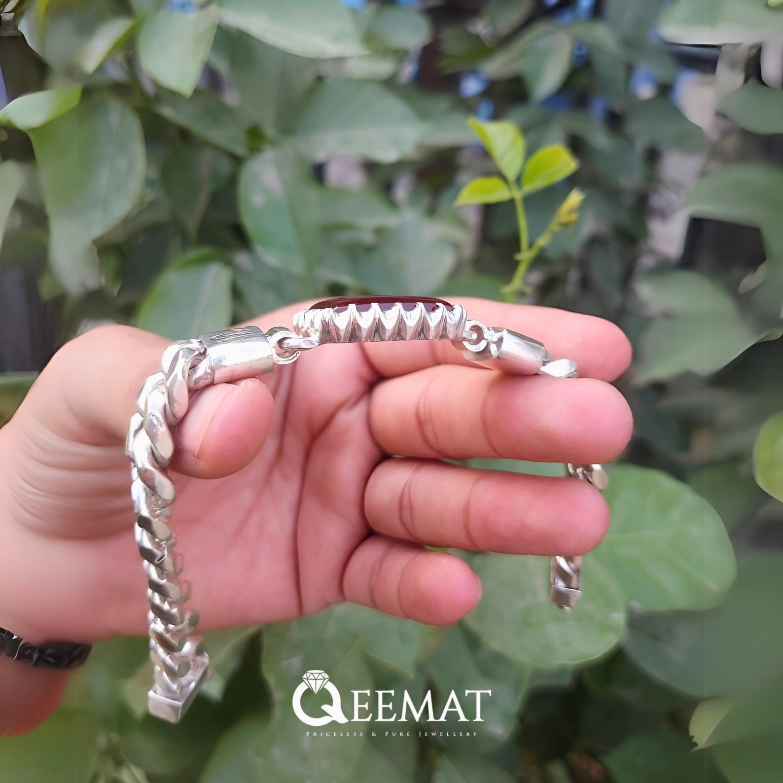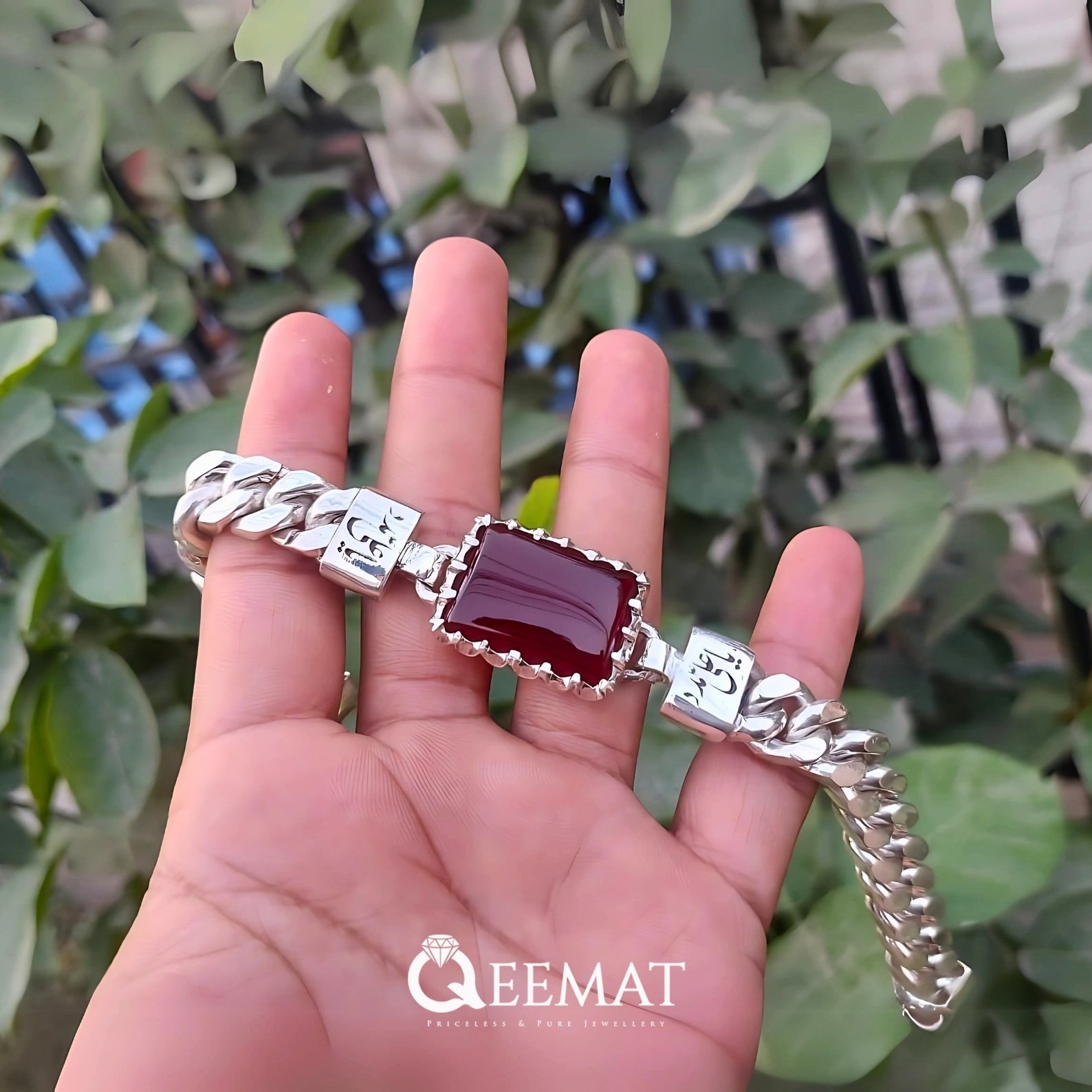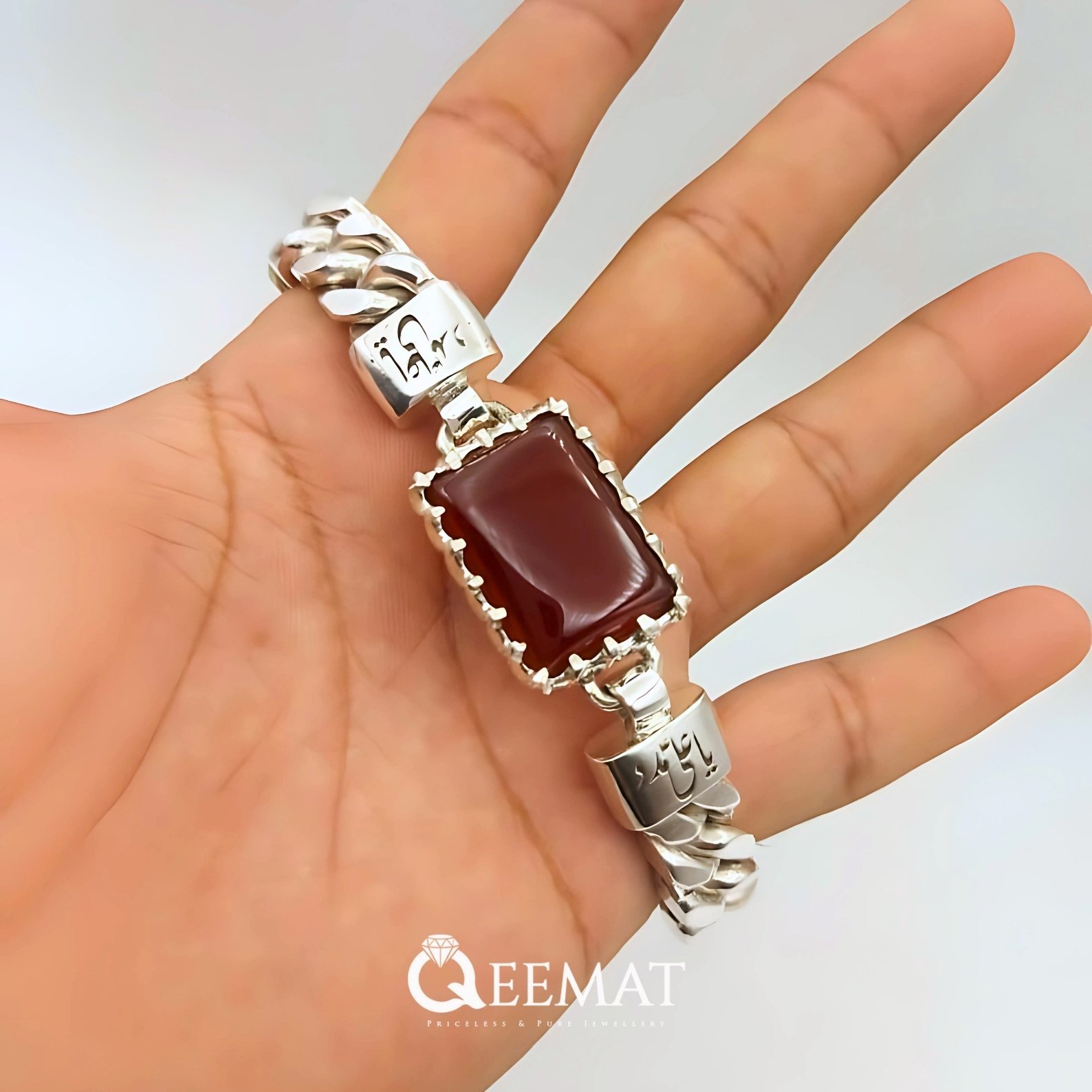 Flanking the stone on either side are silver segments engraved with Urdu calligraphy, which adds a cultural and spiritual elegance to the overall design. However, the Urdu engraving is completely customizable — any name, date, logo, or meaningful symbol can be engraved on these silver blocks instead, making the bracelet deeply personal and ideal for gifting. It can a couple name one on each side of the stone.