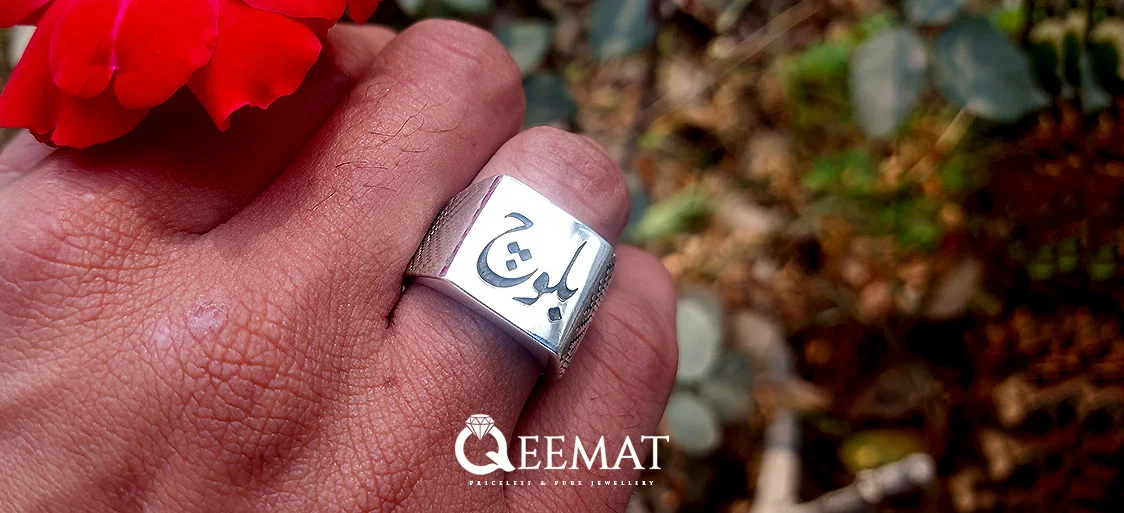 Elevate your name, caste, religious affiliation or any other word with the help of this square shaped signet ring. The first uniqueness of this ring is the clarity of its square shaped head area that is engraved with a name. It is as clean as water and you can get it customized with a verse, word or name of your choice. The second uniqueness is its pattern that is engraved on both of the sides of the shanks of this magnificent silver ring.