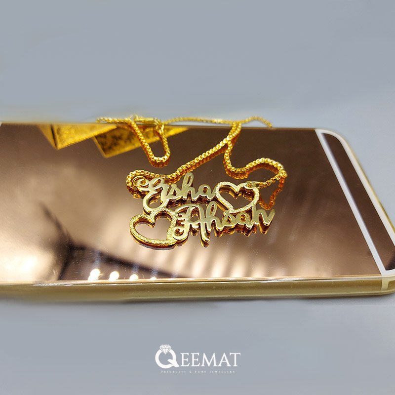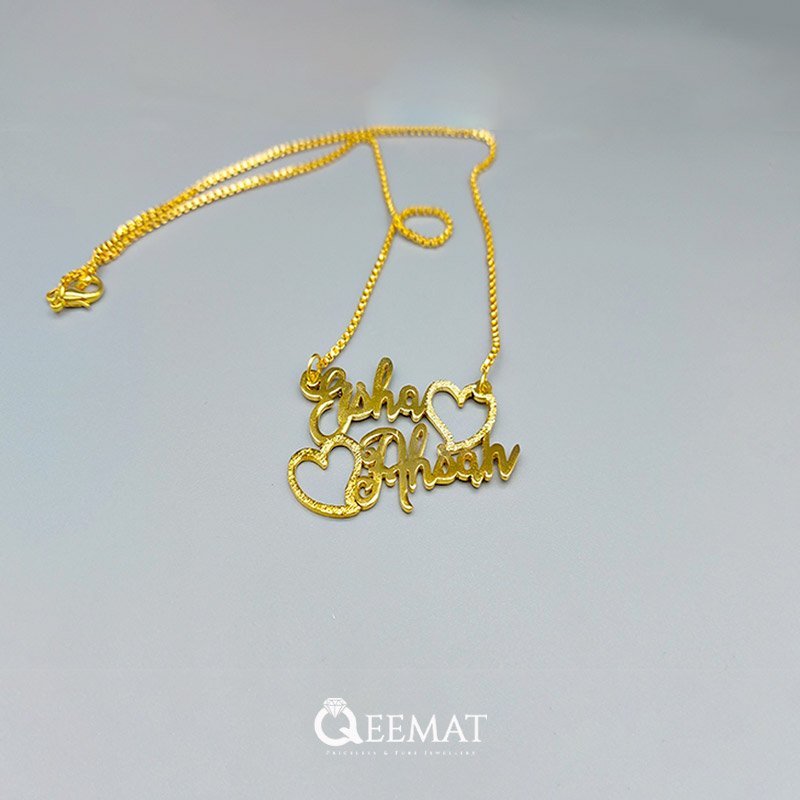 A gold plated pendant with custom couple name