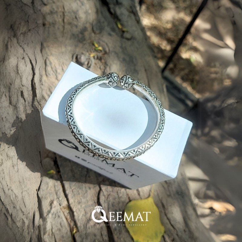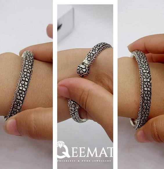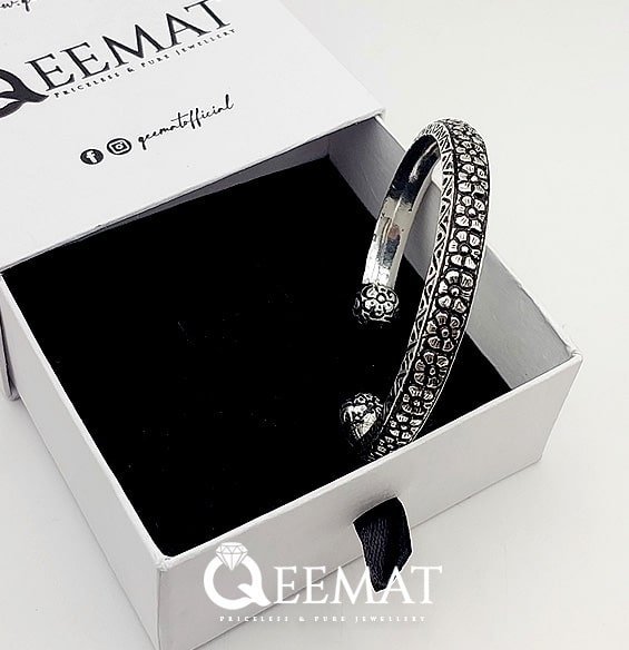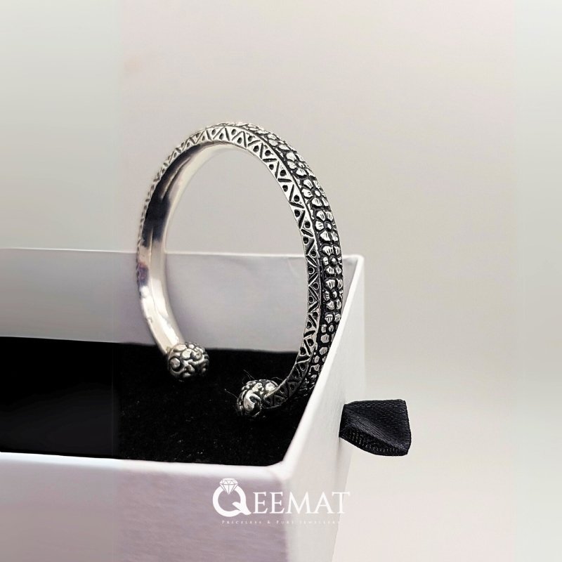 Fashion preference, versatile design, and ease of wear are the most important factors when choosing a hand-engraved cuff bracelet for women. Our craftsmen have used traditional engraving techniques for making this silver bracelet. The raised floral elements give this silver bracelet for women a slightly textured and embossed look, enhancing its visual appeal to the maximum. The most experienced artisan, Jameel Hussain has etched each flower in symmetrical way to create a harmonious and balanced aesthetics. The borders of the cuff also feature subtle line detailing, framing the floral design and adding a polished finish. This cuff bracelet is perfect for those women who appreciate unique and handmade jewelry as it combines traditional and modern style to be fit for any occasion.