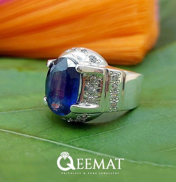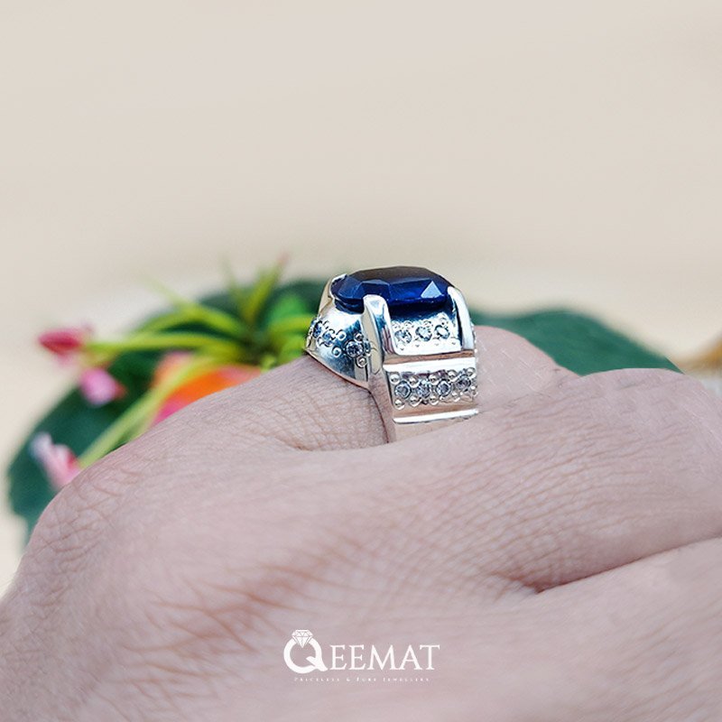Everyone aspires to buy a silver ring that gives you a regal like charm and appearance. This special dark blue stone ring features top-notch finishing, a beautiful arrangement of small stones and four sturdy tab prongs. Together, these elements complement each other to transform this ring into a high class item for men’s fingers. A 7 to 8 carat dark blue stone of sapphire family adds a feather in the cap of this magnificent ring.