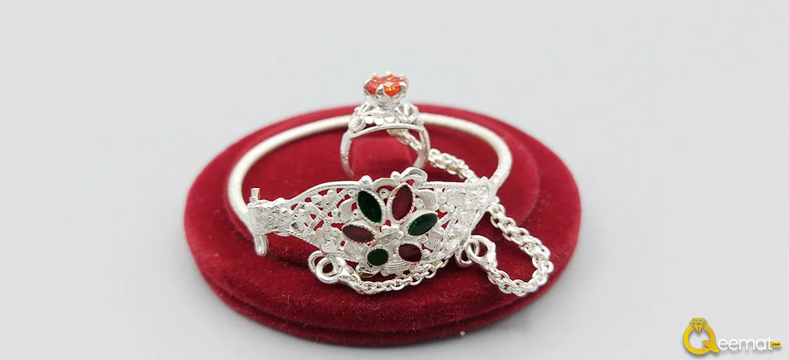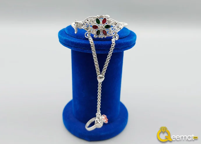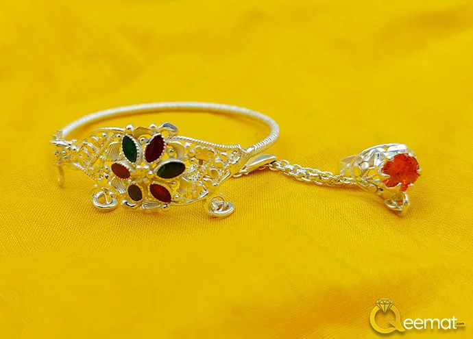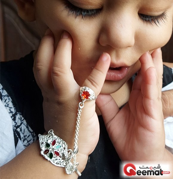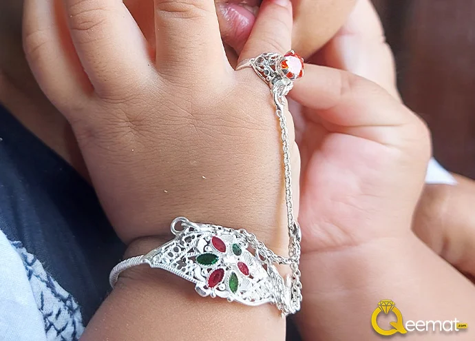 Pure Silver bracelets with beautiful and sparkling chains connected with the rings for your baby are available here. Several silver flakes are concentrated in the following design. Tiny green and red stones in it not only enhance the look of your kids but also show how valuable this jewelry piece is made. Besides enhancing the scent of your children’s fashion, it also encourages viewers to praise your choice in style and fashion.