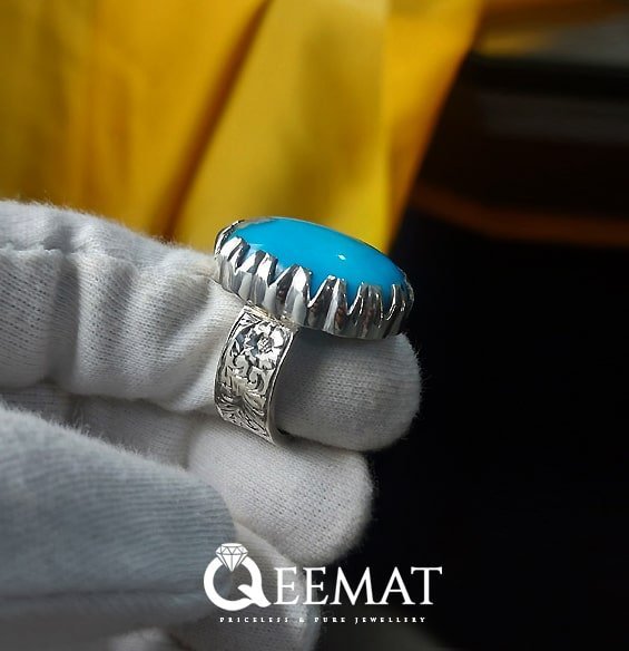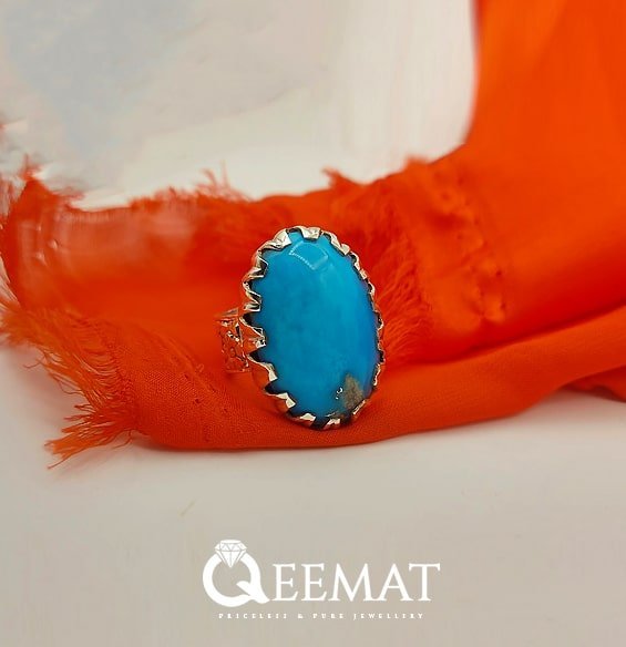 This latest oval turquoise ring has a wonderful contrast of 925 sterling silver and vibrant turquoise gemstone. The visual appeal and patterns on the table of turquoise stone captivates the attention of all the males and females alike. We offer this handmade ring in different qualities of turquoise stone and all the stones are neither treated nor heated. Talking about the ring structure, our ring masters have designed the prongs of this silver ring equally in a new style.