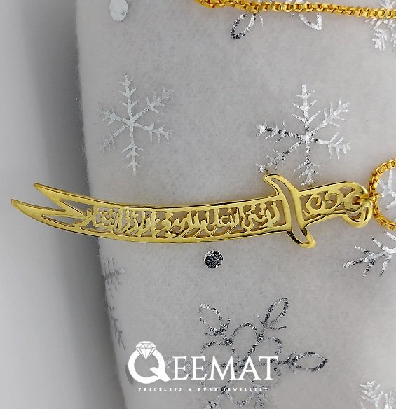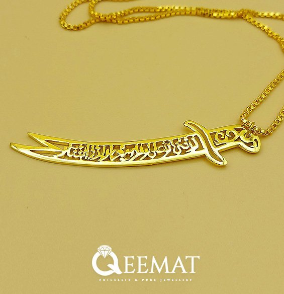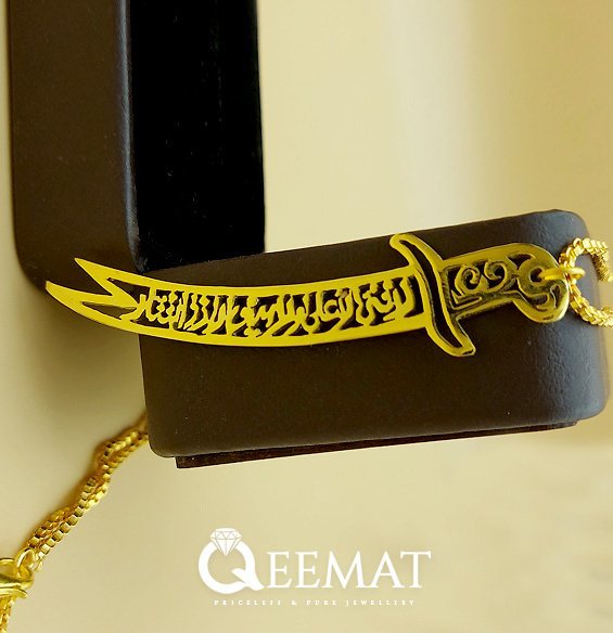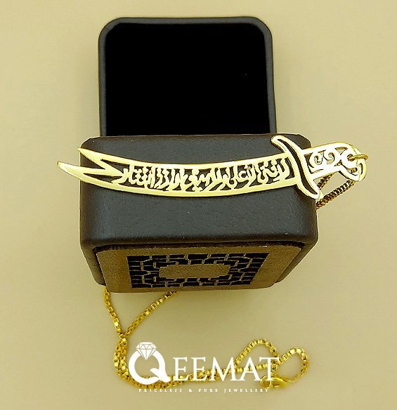 Islamic jewelry can also be ordered as a precious gift. What else could be more worthy than this sword with such words? The Arabic calligraphy used in this design is marvelous and is recognized worldwide by Muslims and non-Muslims as well. Muslims and non-Muslims both can order it.