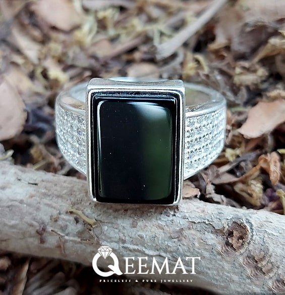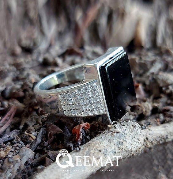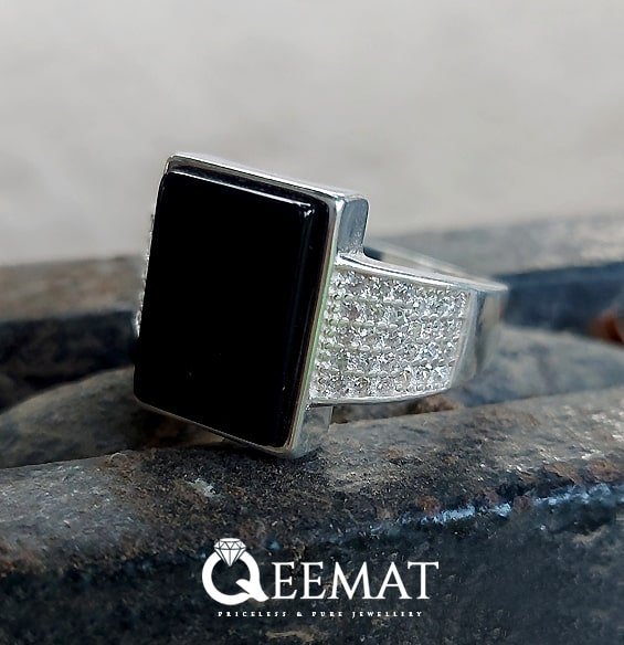 Men’s Silver Ring with Black Agate and Small Zircon Gemstones