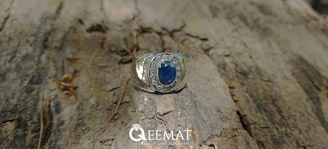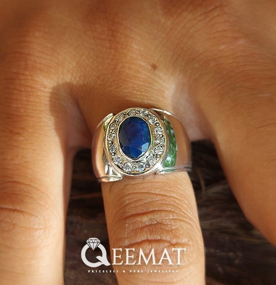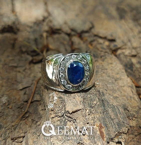 In halo style rings, the center stone is engulfed with an array of smaller zirconia stones. These light gray diamond-like stones amalgamate very well with the gleaming grayish parts of this silver ring. The central stone is dark blue sapphire that is one of the precious stones, adding meaning to this men’s ring. Buy one for you because this silver ring will gently fit your finger without being over tight causing discomfort.