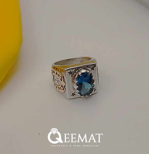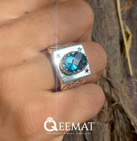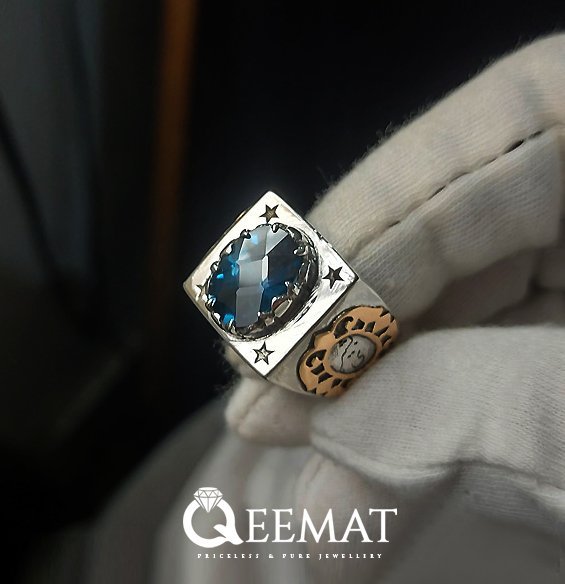 With striking blue color, London topaz gemstone is believed to have strong healing properties. A signet ring with London topaz also comes with striking color combination of pure sterling silver and deep blue color of London topaz. For the personalization of the ring, we have fixed a hand-forged copper piece on both sides of the shank area. In the mid of this embellishment, a name is engraved in Arabic calligraphic style. You can get this name changed and engraved in English, Arabic, Hindi, Urdu or any other landing as well.