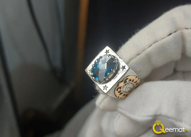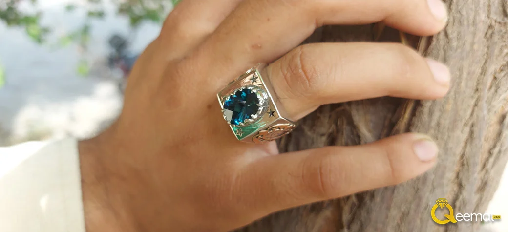 With striking blue color, London topaz gemstone is believed to have strong healing properties. A signet ring with London topaz also comes with striking color combination of pure sterling silver and deep blue color of London topaz. For the personalization of the ring, we have fixed a hand-forged copper piece on both sides of the shank area. In the mid of this embellishment, a name is engraved in Arabic calligraphic style. You can get this name changed and engraved in English, Arabic, Hindi, Urdu or any other landing as well.