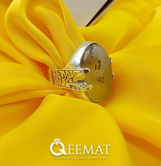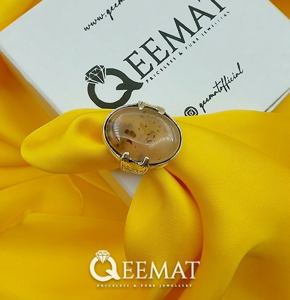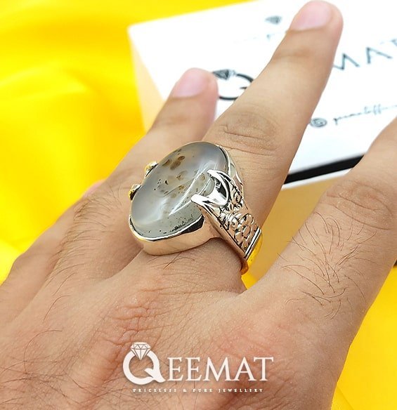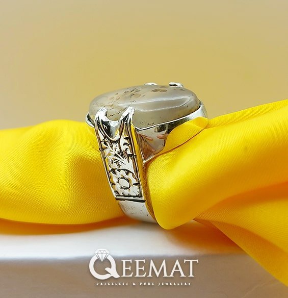 Some gemstones embody a living universe in it like a natural Moss Agate which we have installed in this men’s ring of sterling silver. The commonality in the stone and shoulders of the ring is their fragile wispy and feathery patterns. In the stone these patterns are built by nature while on the shoulders of the ring, our “Parta’ash” masters have inscribed those with hands. The stone is flat from the top and gripped by split prongs on both sides.