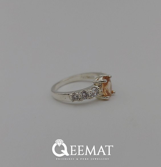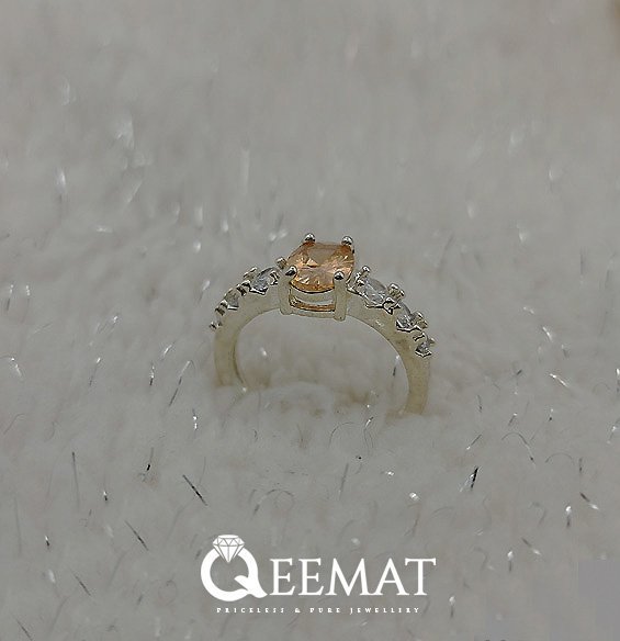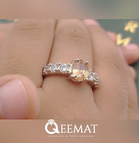 The majority of women like subtle and minimalist ring designs with a medium sized main stone fitted with round smaller ones. Made in 4-pronged design, this ring not only has a lustrous central stone but also 6 small glittering zirconia stones complementing each other to carve out a wonderful pukhraj ring. Yellow sapphire is known as pukhraj among the Asian communities and its prominent feature is its glittering yellow color. We can also make this ring design for you in any finger size.