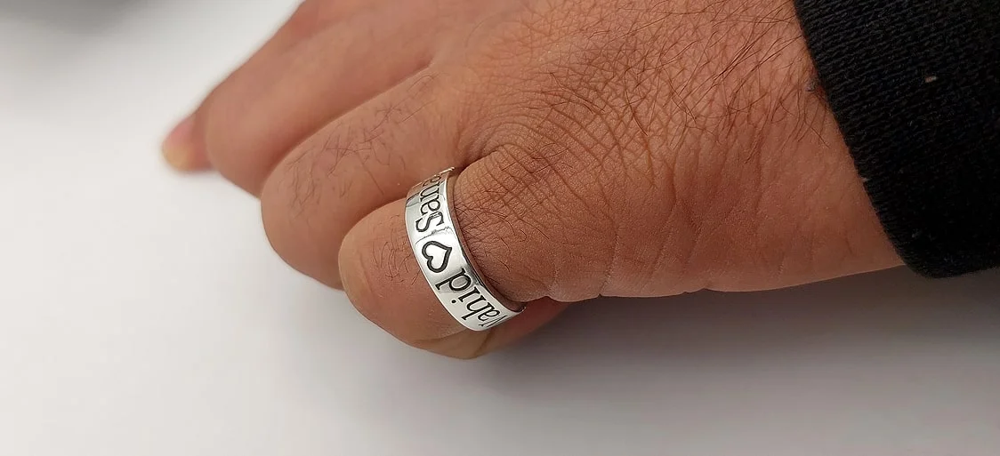 The spirit of showing love can be amplified by gifting a sterling silver band ring with names. You can get engraved a single name, couple name with heart shape, a quote, or any other verse/shape on this silver band ring. This handmade laser engraved ring can be a wonderful gift for engagement ceremony. Shinning and lustrous from inside as well as outside, this ring is a worth-loving and long-lasting gift for your love.