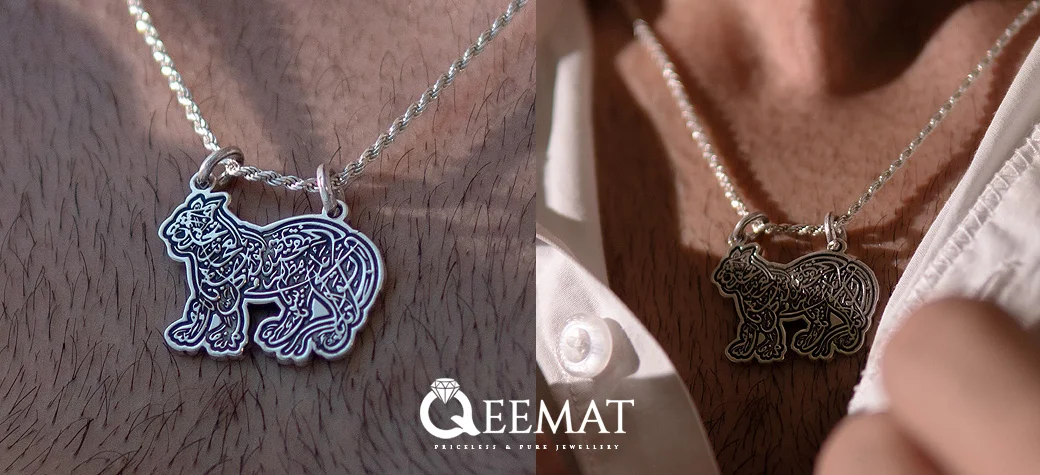 This elegant piece is finely crafted from 925 sterling silver, a high-quality and durable material known for its purity and luster. The pendant is shaped like a lion, symbolic of Imam Ali (AS), often referred to as the “Lion of God” (Asadullah), and intricately inscribed with Arabic calligraphy forming the sacred lines of the Naad-e-Ali dua. The fine detailing and polished finish not only enhance its aesthetic appeal but also reflect the reverence and care that goes into making such a spiritually meaningful ornament.