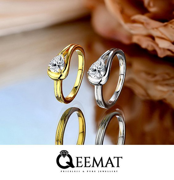 Both the ring color and stone color combines to make a beautiful combination of the ring and the dress. If you choose a white wedding gown, a colored dress or a black dress for a your wedding ceremony, this pear shaped diamond-like wedding ring couples awesomely it. You can choose the stone in light gray diamond-like, champagne, blue or tear green colors. You can choose 1 carat stone or a little big one of 2 carat according to your choice available in all ring sizes.