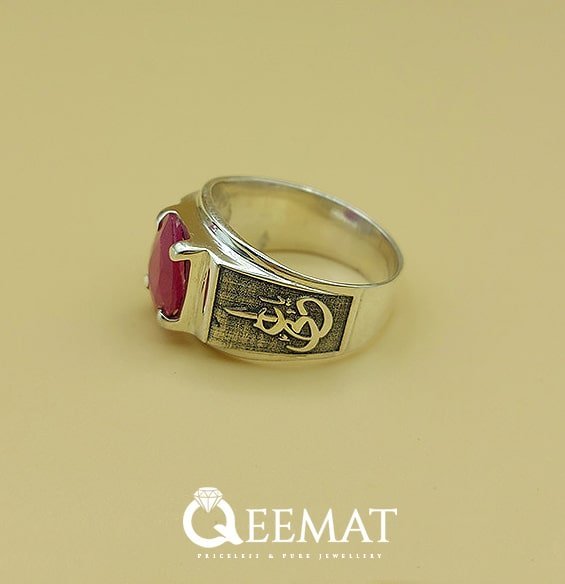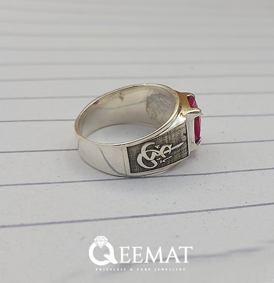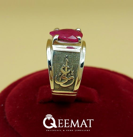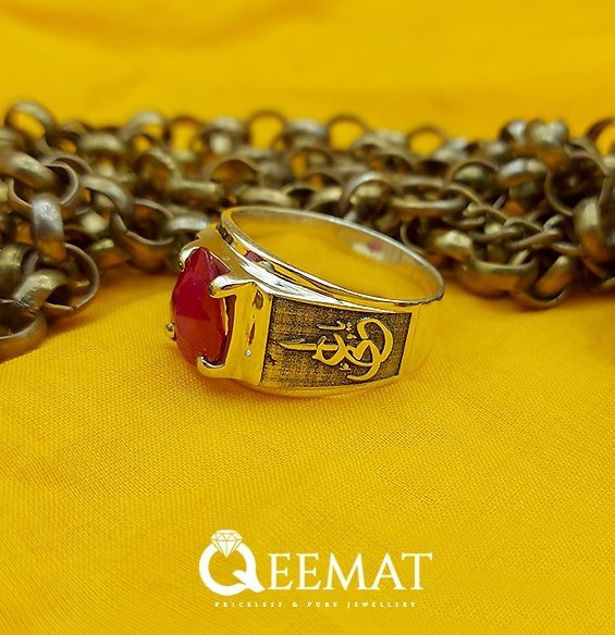 Pearl shape is the symbol of sympathy and a garnet stone of this shape, can put immensely positive impact on your personality. Garnet is the stone for the month of January, people who born in this month can wear this ring for good will and passion. In this 4-pronged ring, the most beautiful thing is the inscribed religious name of Hazrat Ali A.S. As garnet is known for throwing away the stagnant energy from your body, the name of Mola Ali A.S infuses religious passion and energy into your body.